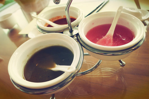 桌上有三種醬料:粉色的是酸酸甜甜的洋蔥醬、紅色的是豆瓣辣醬、咖啡色的應該是和風醬汁。可依食材味覺斟酌使用。