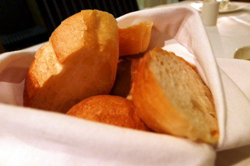 包覆在棉布裡的熱呼呼麵包,法式硬麵包咬起來特別有口感,沾上油醋醬一小口撥開來食用味道很棒!
