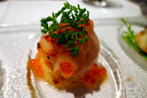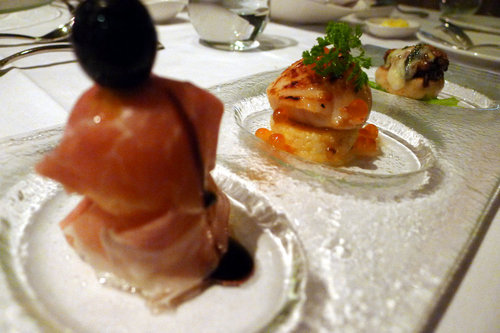 再來是套餐的前菜部份。建議從右至左品嚐。烤田螺/新鮮魚卵搭配煎烤干貝/生鮭魚佐橄欖(這不是正確名稱)我忘記當時的菜單品名。