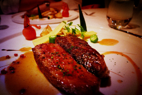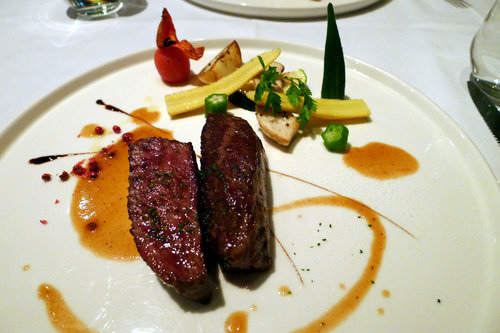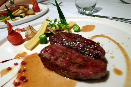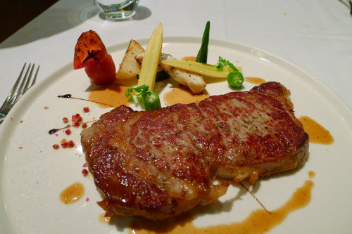 光是看大家一定覺得很好吃吧!沒錯!肉質的水份充足以外,以平底鍋煎到金黃,再噴灑酒汁,瞬間噴出的火燄蒸發掉多餘的酒精,讓酒香滲進肉裡,最後再放至烤箱烤至適當的熟度,擺盤很簡潔,僅用一些蔬菜裝飾,鮮嫩多汁的牛肉讓我們大筷朵頤,如此絕佳的享受讓我們相談更歡。