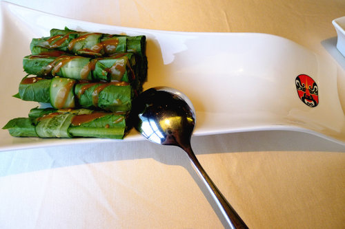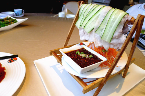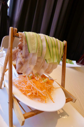 晾衣白肉很多人都有點這道菜。服務人員先送上來後給大家先看一下再拿下去幫大家包裹,用白肉將黃瓜與胡蘿蔔絲纏在一起再淋上特製的蒜蓉醬,吃起來就像我們常吃的蒜泥白肉所不同的是他們的作法更為精緻,而且加上小黃瓜與胡蘿蔔絲更顯的清脆。