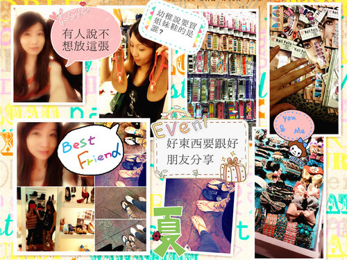 很少與朋友能這樣盡情的逛街。還沒買到指甲貼,我們已經逛了鞋店與服飾店,知道她是大戶,我現在的身份如果再花這些錢在打扮上好像有點過份。→話說我的朋友幾乎都是良家婦女型,專心工作與養小孩及進修,花在打扮上的朋友幾乎是沒有小孩或是單身的朋友較多耶!