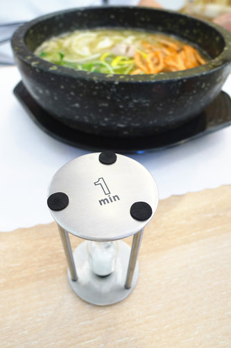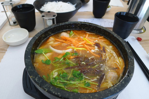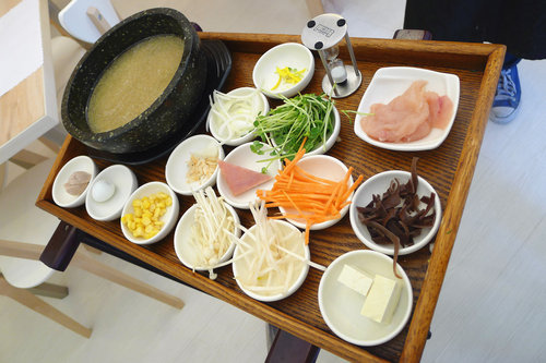 接著就是我們點的十六小碟的菜盤。服務生會把這一盤端到你身邊後再一一把這些材料倒入滾燙的鍋子中,旁邊有個小計時器,約等一分鐘後就可以享用。一開始覺得很新鮮有趣,後來心裡頭也想這跟先在廚房把小碟子中的菜倒進去等一分鐘後再拿出來有什麼不一樣呢?這樣好像比較花時間,等客人一多的話不知廚房人手來不來的及?