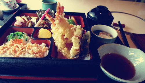 盤裡有炸物、魚、蝦、醋飯、鮭魚卵、藻類食物、醬瓜...多達十幾種的配菜。