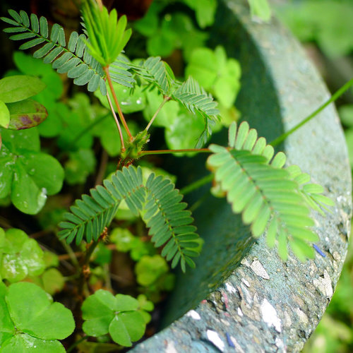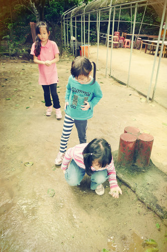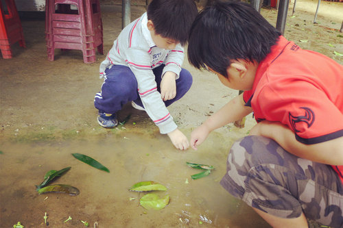 寶貝說這是害羞草,一群小孩蹲在這摸含羞草。