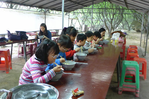 外面下雨 ,中午自己煮肉燥麵,新體驗。小朋友乖乖坐一排吃麵。