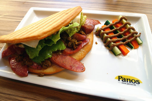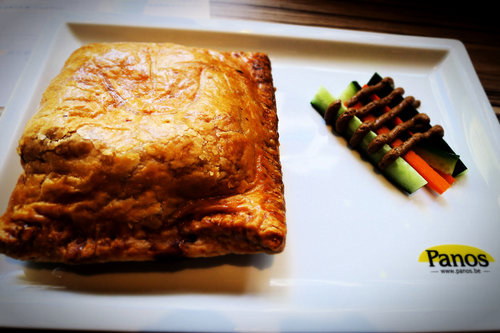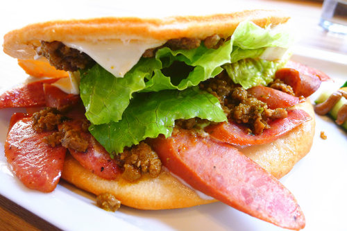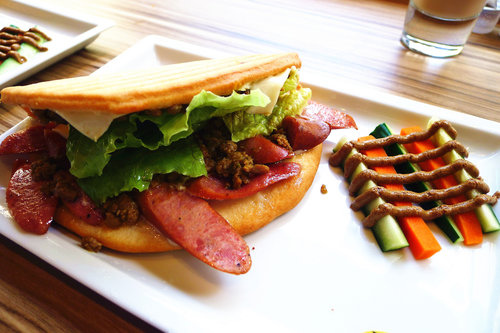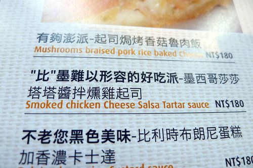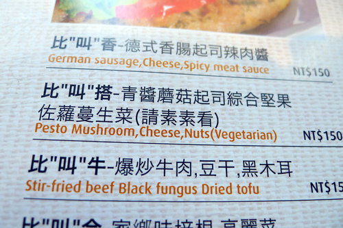比"叫"香德式香腸起司辣肉醬-我個人覺得餅皮很特別,但是味道比較偏重,肉醬我吃不慣,有種我說不出的味道,但是寶貝說很好吃!加上生菜應該是清爽的口感,但是吃了幾口後我覺得偏油,感覺果然是適合西方人的味口,也許是真的很道地。