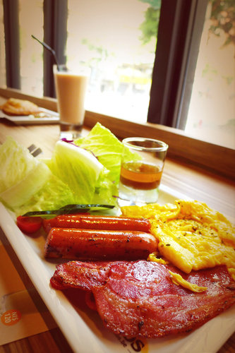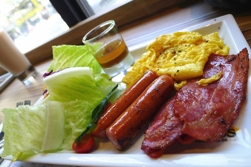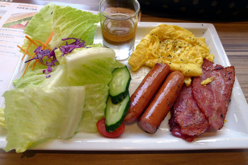 活力早餐來囉~內容是沙拉、火腿、德式香腸、炒蛋。牛奶另外加價享用。