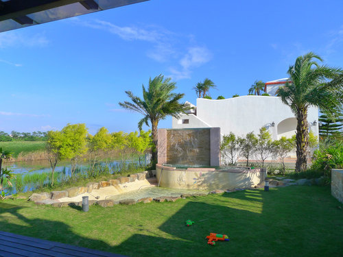 打開門窗,迎面而來的是這片令人感動的綠地與泳池,水槍靜靜的躺在那,孩子的歡笑聲在空中裡迴盪著,有幾對家庭在這裡享受美好的假期,細細保留那份溫暖的記憶。