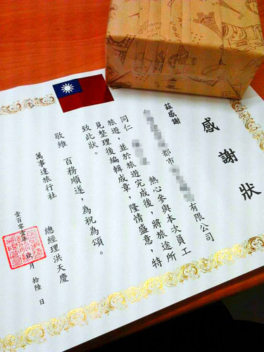 十點不到,郵差送來了包裹,正在納悶最近也沒郵購什麼商品,打開包裹裡面是一張感謝狀及一份精美的小禮物,心中的驚訝與喜悅非筆墨可以形容,我沒有想到這家旅行社的後續服務居然是那麼的讓人感到貼心,心中滿是感動。平常我不過是愛寫寫文章尚不成氣候,但經過上個禮拜照片上了雅虎的精選與這次旅行社的感謝狀之後無疑給了我很大的鼓勵。 感謝我身邊的每一位朋友與貴人,我知道每本書,每一篇文章在這個社會裡都有不同想法與階級的人在看,每個人的價值觀也不盡相同,但是可以被認同對我而言真的是非常棒的禮物,再次感謝萬事達旅行社的溫暖之情,希望我們的社會藉由相互的鼓勵與正面的讚美力量而成就更多更美好與更棒的人!!