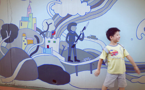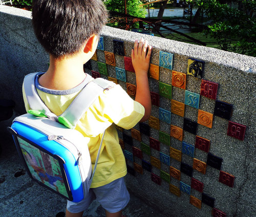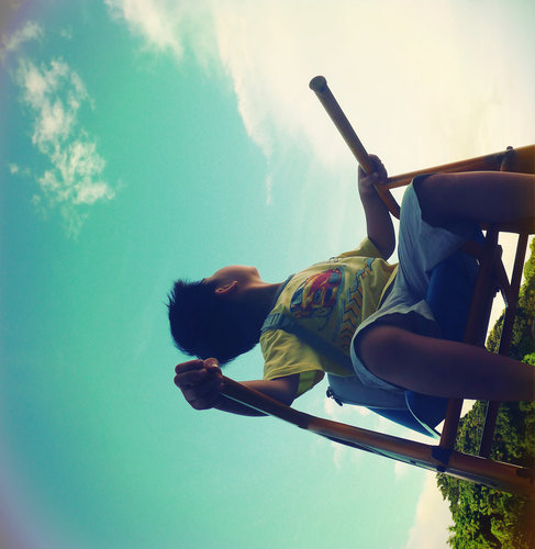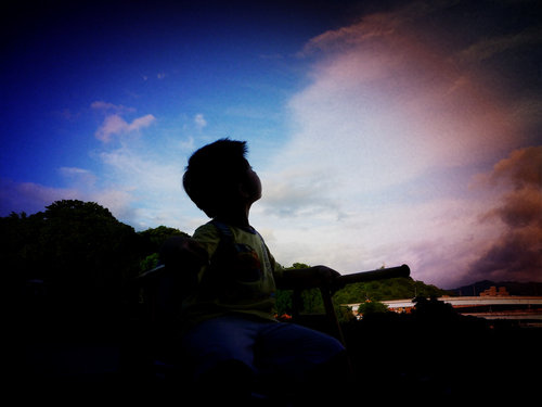 今天在閒逛的過程有段小插曲,就是孩子很想爬上那座高腳椅坐在上面看看藍天,不過在我們之前有二個孩子也正在上頭坐著欣賞,於是我們就坐在旁邊階梯等候,約莫過了十幾分,孩子開始有些抱怨,覺得為什麼有人在排隊他們不快一點。後來前面兩個孩子玩好了下來了,換兒子上去,一樣的,在我們身後仍有其他孩子排隊,兒子上去坐了一會過個乾癮就下來了。