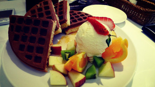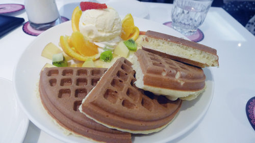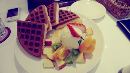 鬆餅公主的價位平易近人,而鬆餅的選擇也多樣豐富,因為是第一次來所以我們決定先嚐試入門的基本款鬆餅。其實這道厚實的鬆餅吃起來跟外面差不多,但我很怕吃到冷掉又硬邦邦的內餡,這裡完全不會!而且沾上奶油與冰淇淋還有當季水果,酸酸甜甜的滋味及入口即化的冰淇淋,真是過癮!