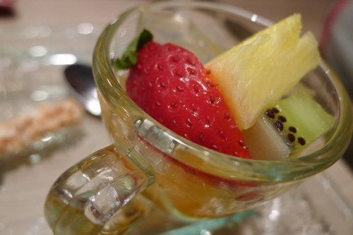 但是甜點的部份卻讓人眼睛為之一亮!我想這家的主打商品應該是在午茶的部份。軟綿綿的巧士達與甜甜的草莓搭配酥脆的餅乾,好吃極了!