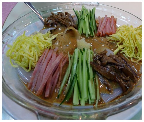 兩張皮 材料有 蛋皮、小黃瓜絲、火腿絲及涼粉搭配芝麻醬拌勻很爽口的一道菜。