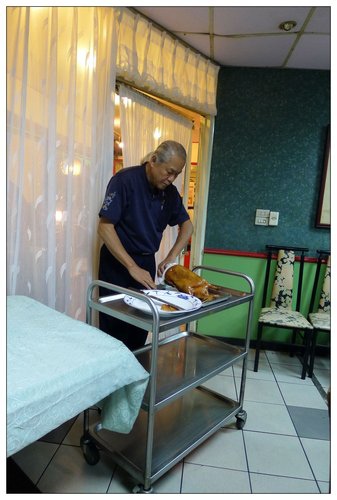 師父開始一刀一刀的把烤鴨的皮劃割下來,切的很漂亮果然是功夫老道。而且在切的同時烤鴨香味四溢。我忘了拍烤鴨的擺盤了.....只顧著吃....