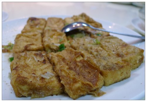 鍋塌豆腐這道也好吃!表皮上沾了一些蛋汁再下去煎的豆腐,上面又灑了一些胡椒粉,外面的皮有些脆焦裡面的豆腐也很滑嫩。