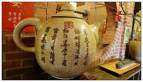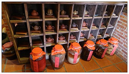 門前瓶瓶罐罐的醃漬物及收藏的茶壺。