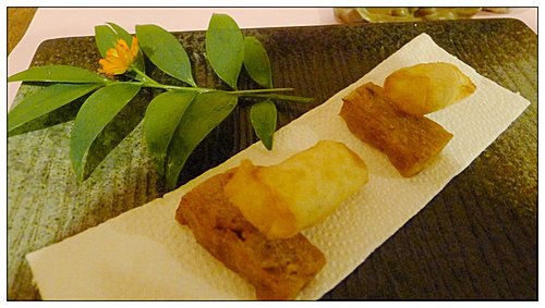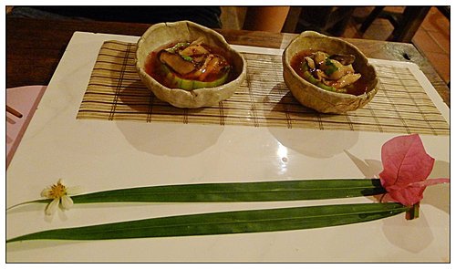 先上桌的小菜(牛蒡絲、蘆筍及醃製過後的果干)甜甜的,口味都很清淡沒有過多的調味。