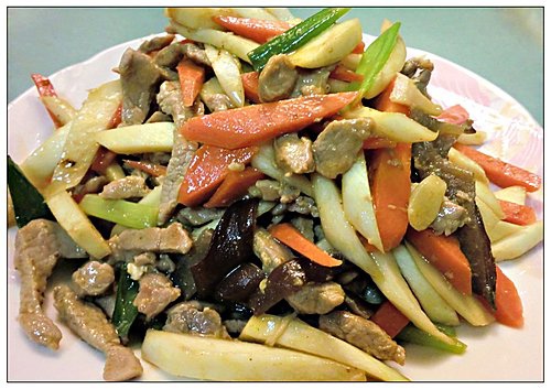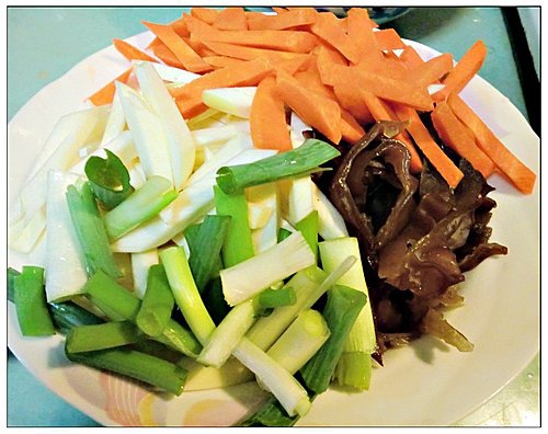 準備材料:豬肉絲/雞蛋一顆/太白粉5克/醬油15ml/蔥一支/筊白筍120克/木耳/紅蘿蔔些許/水/香油/米酒/白胡椒粉少許→準備木耳/紅蘿蔔/筊白筍切絲/蔥切段。