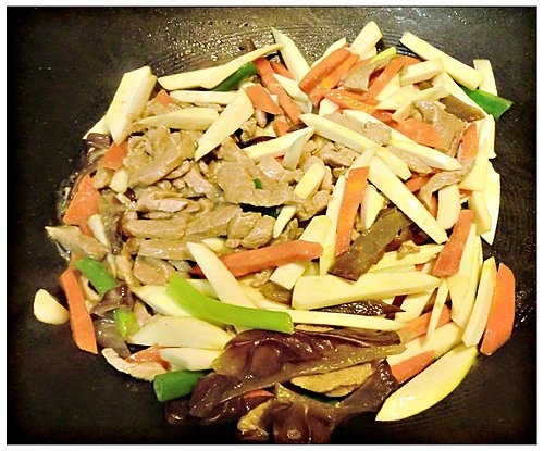 作法2.爆香蔥段放入作法1→炒香→再加入木耳/紅蘿蔔/筊白筍/水/香油/米酒/白胡椒粉炒熟即可。