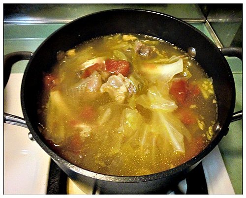 牛肉我跑去師大附近的國際牛肉店去買,回來川燙後再丟進鍋裡另外加上蕃茄、洋蔥、胡蘿蔔及高麗菜燉三小時以上即可。不過我覺得三小時似乎還不夠牛肉的香氣沒有入到湯裡,應該要燉更久還有要蓋鍋慢燉。