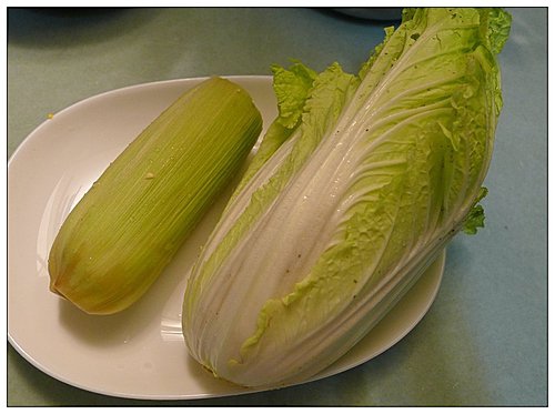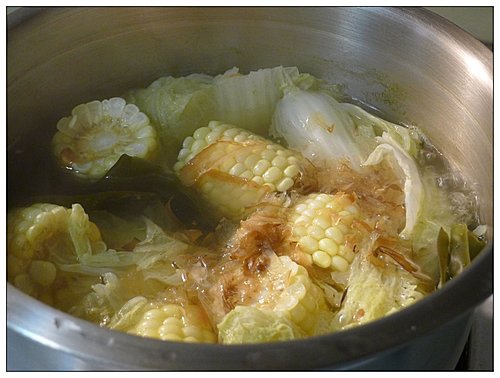 繼上禮拜買好的日高昆布後這個週末馬上來試煮看看,前一天我就先把昆布拿出來泡水等蓬脹後就把水倒掉放進冰箱冰了一晚。今日先放好一鍋水把昆布放進去煮,另外我又準備的蕊茂有機蔬菓園的自然農法白珍珠水果玉米及旺來農場生產的有機大白菜把這兩樣洗好切好後放進去一起滾約一小時半。