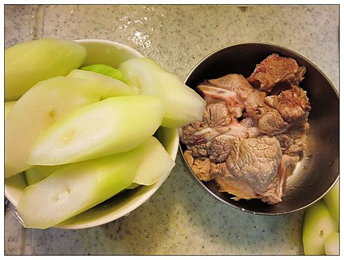 作法:先放一鍋水再把燙過的排骨及菜心丟進去煮滾就可以,大火約30分鐘小火也是30分鐘。最後再放入鹽巴就好了。不過婆婆說現在不是菜心的季節,所以菜心中間會有白白的一圈。奇怪?如果不是菜心的季節怎麼還買得到菜心呢?