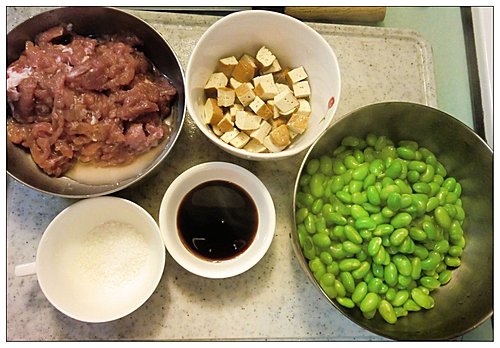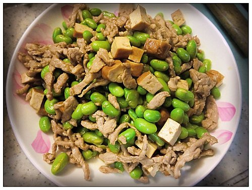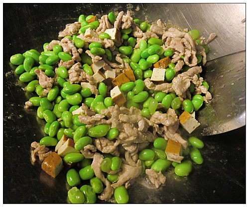 好了!起油鍋囉~先把腰內肉放進去炒熟後再丟入毛豆及豆干拌炒約3~5分鐘。