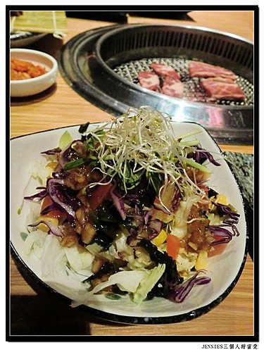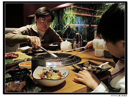 我們點的是雙人份的晚餐:有沙拉、各式烤肉(牛肉、霜降松阪豬肉、雞肉、鴨肉)豬肉部份可搭配泡菜,