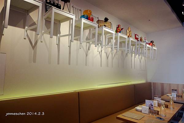 餐廳這一處的設計富有創意,不過大人小孩的反應都是--東西會不會掉下來? 我猜物品應該都是黏死的,不然地震一晃打到下面用餐的人可就麻煩囉~ 每張椅子上擺的都是古早童玩,在簡約設計的空間裡融入一些童趣生活擺飾滿有意思的。想起當時年紀小,無憂無慮的日子裡也充滿一些天真單純的微小幸福,那時候的我們,心很簡單。