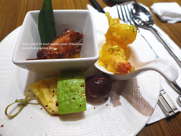 前菜的烤雞翅真的相當好吃,雞翅的酸甜醬很濃郁,而旁邊的焗烤蝦也太好吃了吧!建議從蝦子先吃起再吃雞翅,各有各的風味,最後喝個薄荷茶再吃水果,整個神清氣爽啊!