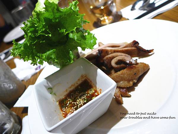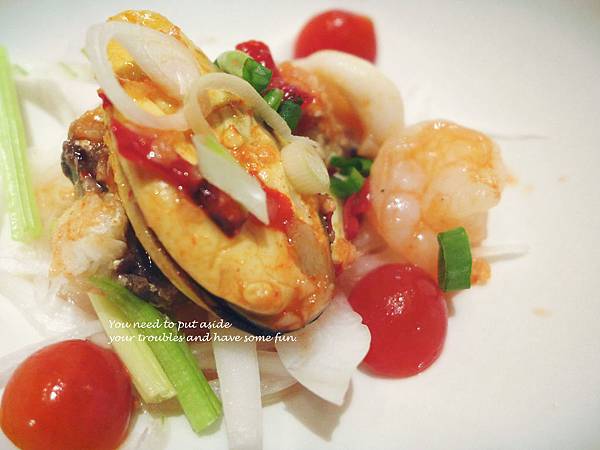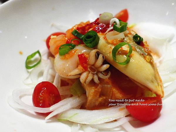 再來是我覺得今天吃到最棒的一道了-酸辣海鮮沙拉,他們調配的酸辣醬汁又甜又酸又帶些微辣,與生洋蔥沾著吃,一些些的洋蔥甜味再一點點的嗆辣度.....太銷魂了!