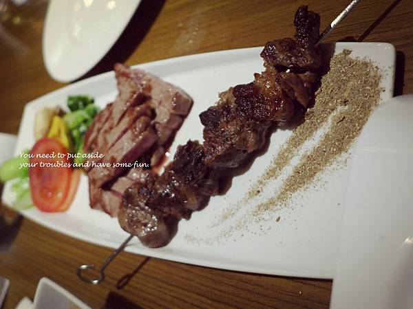 同事點的三味沙朗牛排(一次可以吃到三種不同口味的牛肉)是不是很棒呢!口感很多變。