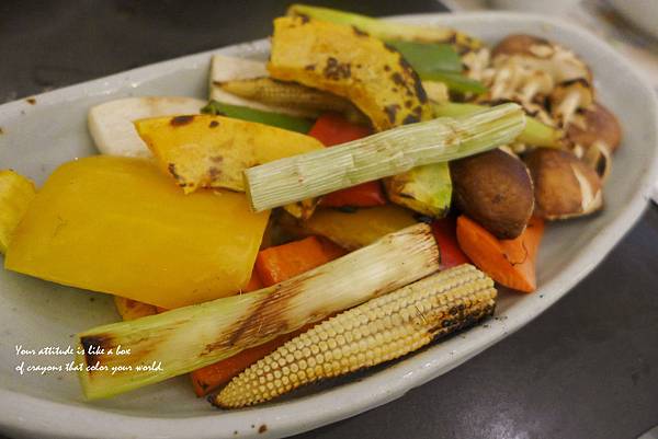 現場吃時覺得烤太焦了,而且又非常飽足,所以這道有打包回飯店,沒想到等放涼後這麼好吃!每種菜的原味及甜味都是最直接的,其實沒什麼調味只加一點點鹽,雖然有附沾醬給我們,但直接吃就已經非常好吃了,由其是香菇咬下去滿滿的湯汁,好過癮。我平常很少吃烤的,原來烤的蔬菜那麼甜。