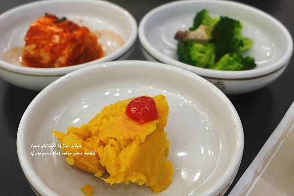 再來,三元的小菜非常多樣化,我沒算總共有幾盤,但陸陸續續上桌的應該有十盤左右。前面這個是地瓜泥/泡菜/花椰菜,其他還有小黃瓜/海帶絲/龍鬚菜/韭菜