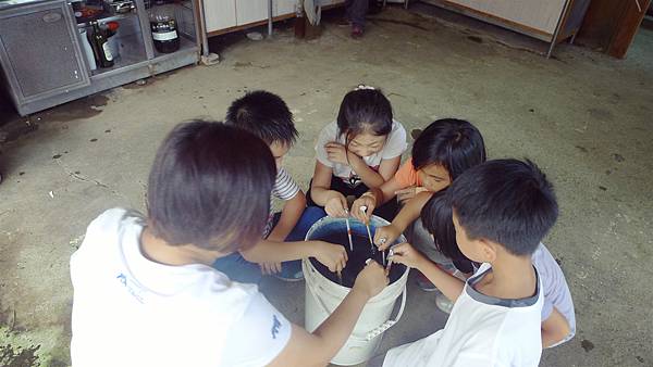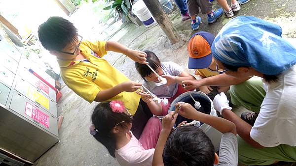 然後解說阿姨帶領著大家去顏料罐那手作體驗。