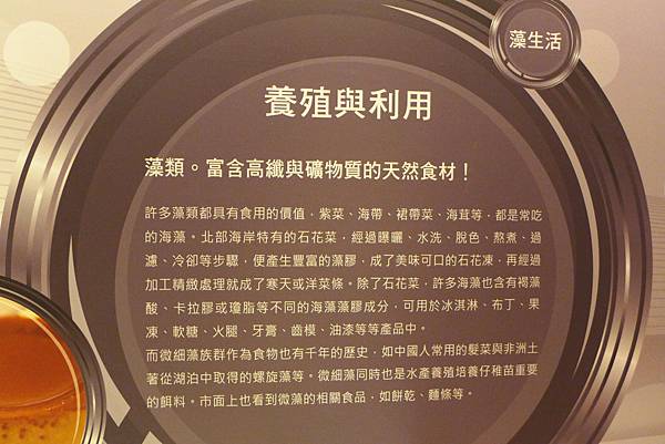 今天剛好是關於海底藻類的介紹,沒想到藻類用途這麼多,可用於冰淇淋、果凍、火腿、牙膏等等物品。我們從入場處先看看各式藻類的圖片說明,現場也有實體可以觀察喔!