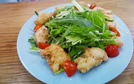 接著是雞米花野菜沙拉,這道菜一開始我們就先把沙拉做好,剩下的就是雞肉的部份留到後面在做。材料與作法在這邊一樣提供給大家,大家有興趣可以在家做看看,真的不難喔!