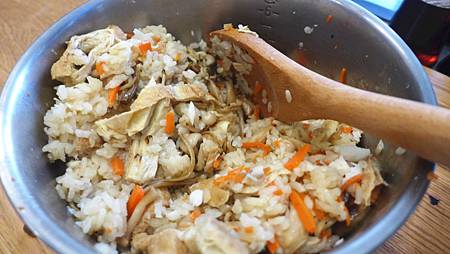 鮮魚什錦日式炊飯-材料有:白米2杯/白魚肉1片/新鮮菇類約1杯/油豆腐皮1張/胡蘿蔔1小段。調味料有米酒2大匙/龜甲萬料亭和露(鰹魚)2大匙/味醂1大匙/鰹魚昆布高湯2杯。炊飯調味料:米酒1大匙/龜甲萬甘醇醬油1大匙。作法:我們先把胡蘿蔔切絲,豆皮切絲備用,然後將菇類先炒香(不放油炒至縮乾)再加入米酒,龜甲萬料亭和露(鰹魚)和味醂炒勻起鍋備用。接著電鍋中放入白米,一杯米對一杯高湯,上面均勻鋪滿炒好的料及魚,最後加入炊飯調味料烹煮。一開始先將魚兩面煎至金黃備用。最後飯煮熟後關蓋燜個十分鐘即可。