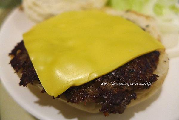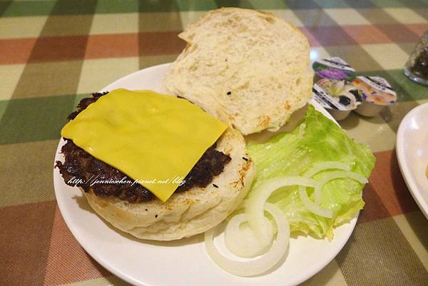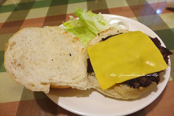 漢堡來了!有點傻眼,就一片起司加一片肉及些許生菜,感覺單薄。
