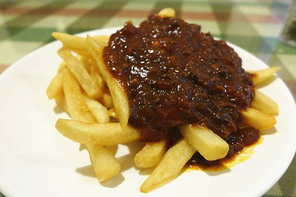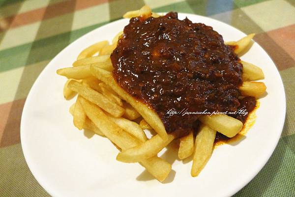 看別桌點了薯條我們也點一份,好奇上面的醬料是什麼?一吃之下原來是黑胡椒肉醬,好奇特喔!不過這樣吃法有點過鹹,薯條普通!就像麥當勞的口感差不多。