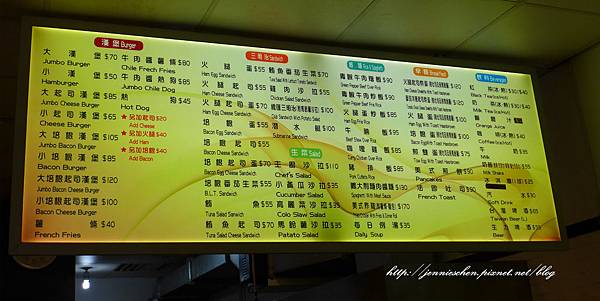店內賣的餐點都在看板上,很多人上門前來外帶。店內還是以漢堡為主。大漢堡一個要70元,小漢堡也要50元,加起司20元/加培根及火腿40元。除了漢堡還有三明治及生菜、飯、麵、早餐跟飲料。