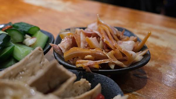 小菜入口有清香的中藥味道,滿特別的,淋上一些香油、蔥,花干裡浸泡滿滿的中藥材料,吃起來頗為特別,豬頭皮則是太肥了點。