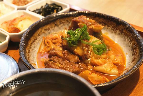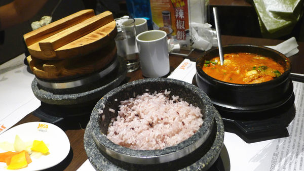 韓國的傳統石鍋飯,特別強調生米原鍋煮成飯所以特別使用了韓國特製的角閃石做成的石鍋,並精選來自東部地區的優良米質混合了營養價值高的紫米,利用石鍋高壓的特性煮出有別一般米飯的口感更香更甜更Q彈。大家都特別喜愛包著海苔片吃,淡淡的米香與海苔一起吃,一點點的鹹香入口伴隨著海苔的美味,好好吃喔!然後你也可以一口飯加一口泡菜鍋一起吃,我點的是海鮮泡菜鍋。