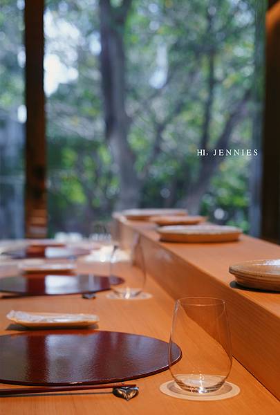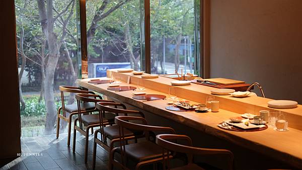 餐廳提供大包廂12席,小包廂4席,我們今天被安排至板前,有9席。走入板前空間瞬間明亮,大片玻璃窗將自然光引入,木質設計空間流動著禪意帶出簡約和諧的氛圍,窗外綠意相擁樹影婆娑。午間價位二階套餐2000元/壽司套餐2000元;晚餐價位二階套餐3500/5500 壽司套餐3500元/5500元;