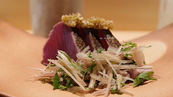 炙燒過後逼出油脂香氣,搭配茗荷與紫蘇葉最後淋上橙醋漬白蔥,鰹魚在日本家庭餐桌上經常出現,香氣均衡,口感亦清爽綿密,不過紫蘇的味道如果能再突出一些會更好。