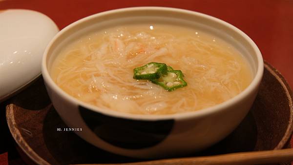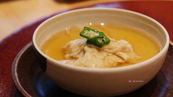 師傅為我們準備暖湯先熱個身子,勾芡的濃湯喝起來帶有淡淡的香氣,上方是松葉蟹,底層是玉子蒸,入口滑順,勾出層次漸疊美味不在話下。