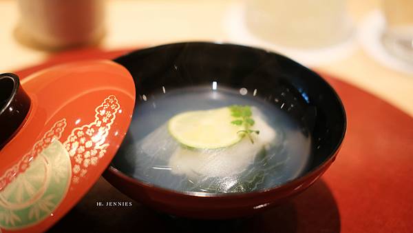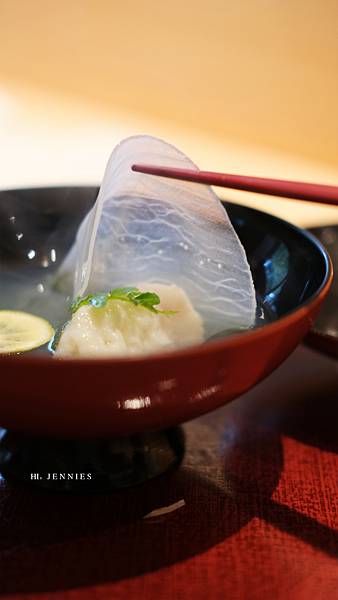 這道上桌也覺得挺美~內容有鏡蘿蔔、酸桔、木之芽。鏡蘿蔔覆蓋在其上就像是冬天水面結冰一樣,水面下方則有著豐富的海產的意境想像。