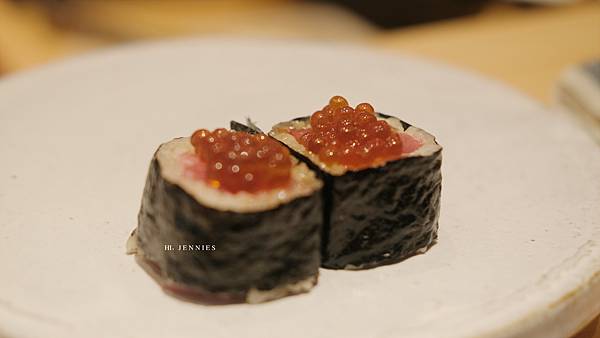 三色鮪魚太捲包含赤身、中腹、大腹三種部位。不過建議這道可以擺在前面幾道開場,後面再吃這道會有點膩。