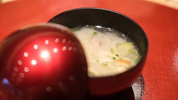 臺灣溫體黑豬肉酒粕味噌湯 選用臉頰的部位帶筋與膠質 湯底酒粕與白味噌調製 湯的甜味全來自於豬骨高湯跟酒粕